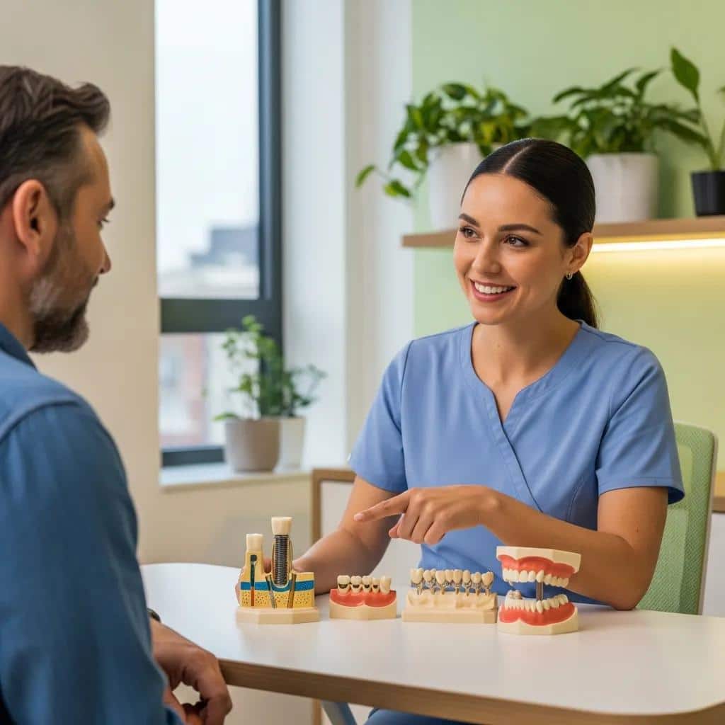 • Dental implants: Durable and bone-preserving but require surgery and ongoing peri-implant maintenance.